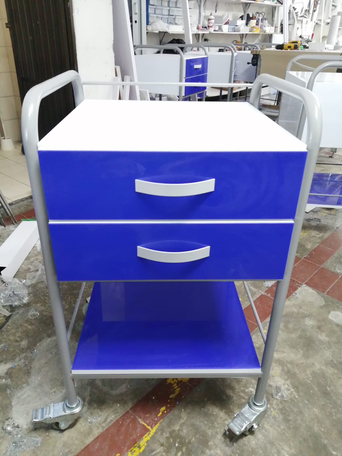 - Gavetas: Una (1) o dos (2) gavetas elaboradas en PVC (Polivinilo) y ABS, altamente resistentes a la humedad, antibacterial y de fácil limpieza, con separadores de medicamentos.